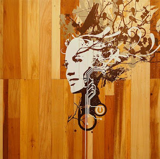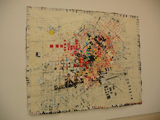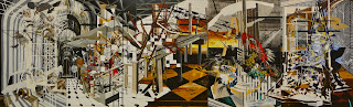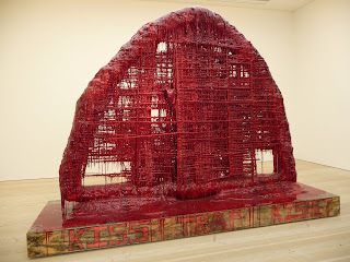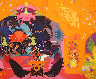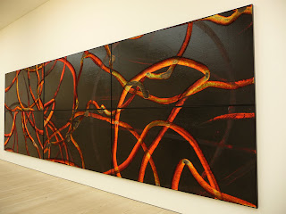 - the making of this piece was staged as a performance: 6 plywood panels were laid out on the floor then stained and painted with layers of yellow, pink, orange and red, and covered wiyh final coat of jet black